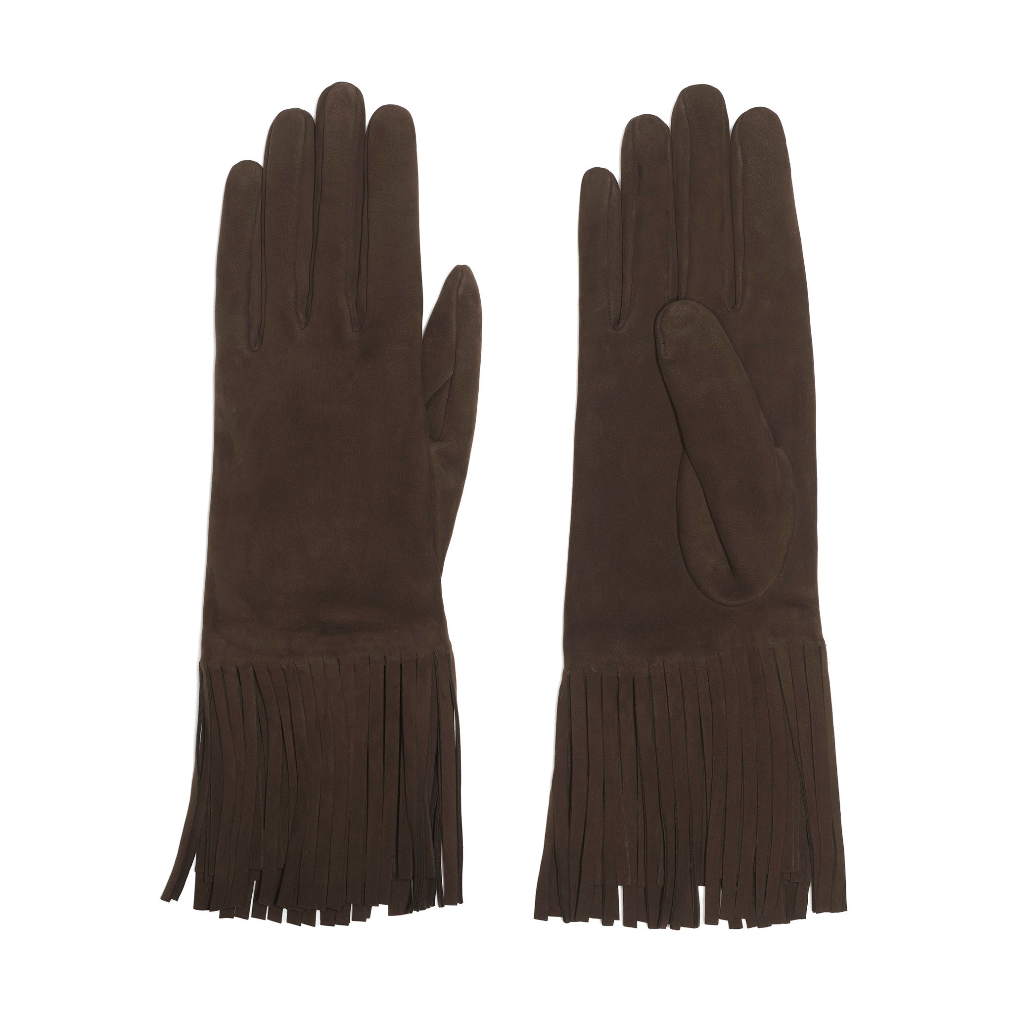 Fabriqués en France à Millau, capitale historique de la ganterie, ces gants mi-longs en nubuck d’agneau, doublés en soie, se distinguent par leurs coutures intérieures délicates et leurs longues franges découpées à l’emporte-pièce, symbole d’une maîtrise artisanale d’exception.